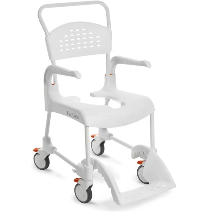 Der Clean erlaubt dem Nutzer eine weitestgehend selbstständige persönliche Hygiene, dem Pflegepersonal wird das Helfen so einfach wie möglich gemacht. Alle Teile des Duschrollstuhls Clean erfüllen höchste Anforderungen an Form, Funktionalität und Qualität. Verbesserter Zugang.Der Clean ist in der reinen Schiebeversion mit vier kleinen Rädern ausgestattet, kann aber alternativ auch mit 24 Zoll Antriebsrädern versehen werden. Eine nachträgliche Umrüstung ist ebenfalls möglich. Der Sitz des Clean ist nach hinten offen, sodass für Benutzer und Pflegepersonal eine optimale Zugänglichkeit möglich ist. Die Armlehnen können nach außen geschwenkt oder auch ganz abgenommen werden. Die in der Höhe verstellbare Fußplatte lässt sich komplett unter den Sitz schieben, sodass ein Hinsetzen auf den Stuhl wesentlich erleichtert wird.