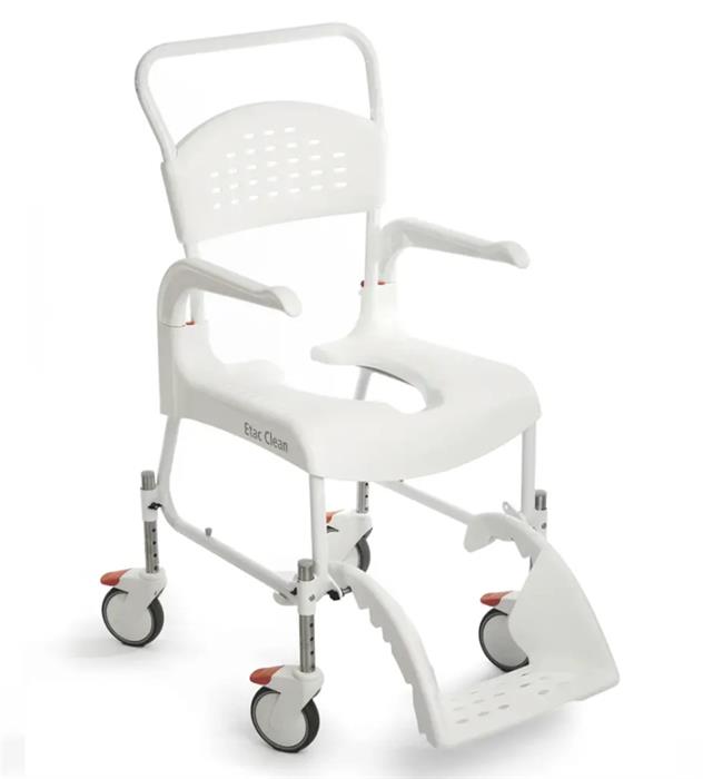Der höhenverstellbare Dusch-/Toilettenstuhl Clean ist stabil und einfach in der Handhabung, für Nutzer und Pflegepersonal. Jedes Detail unterliegt genauen Designvorgaben und Anforderungen an Form, Funktionalität und Qualität. Clean Höhenverstellbar ist einzigartig funktionell und äußerst variabel. Der Sitz ist nach hinten offen, sodass für Benutzer und Pflegepersonal eine optimale Zugänglichkeit möglich ist. Die arretierbaren Armlehnen können zur Seite geschwenkt oder auch ganz abgenommen werden. So wird der Transfer wesentlich erleichtert. Die in der Höhe verstellbare Fußplatte lässt sich komplett unter den Sitz schieben, sodass ein Hinsetzen auf den Stuhl wesentlich erleichtert wird. Mit wenigen Handgriffen kann die Sitzhöhe des Clean schnell und einfach zwischen 47,5cm und 60cm variiert werden. Die leicht gewölbte Form des Fußbretts gibt auch nackten Füßen sicheren Halt. Eine besondere seitliche Ausformung schützt die Füße vor dem Schwenkbereich der vorderen Räder.Produktdetails: