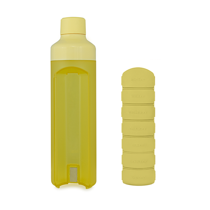 Trinkflasche mit Tablettendispenser, gelb mit 7 Pillen-Fächer