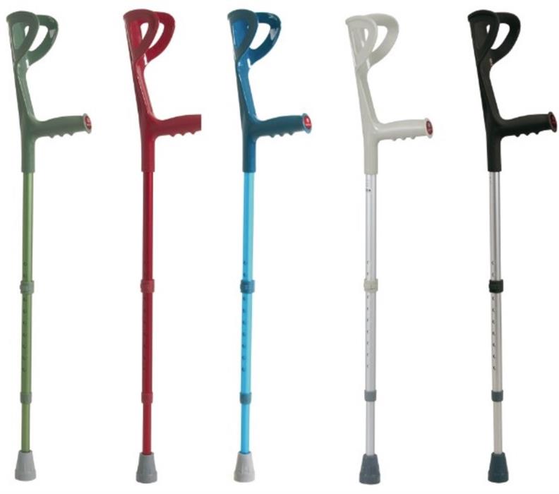 Leichte Unterarmkrücke. Ergonomisch geformter, rutschfester Griff, spritzgegossen und aus einem Stück gefertigt, für Komfort und Sicherheit. Geräuschdämpfender Ring an der Schiebestange. Einfache Arretierung der Einstellung mittels Clip. Reflektierender Knauf an der Vorderseite.