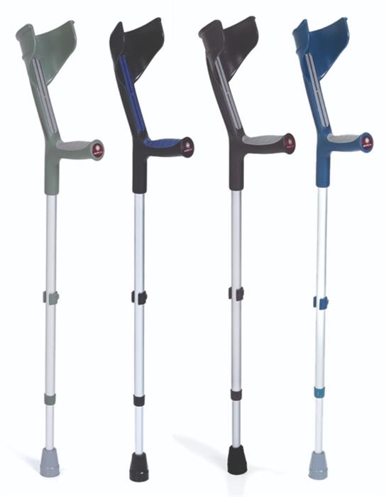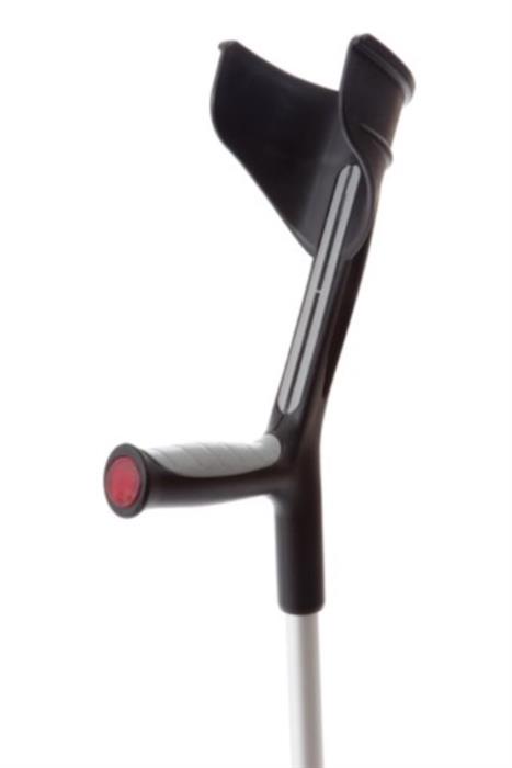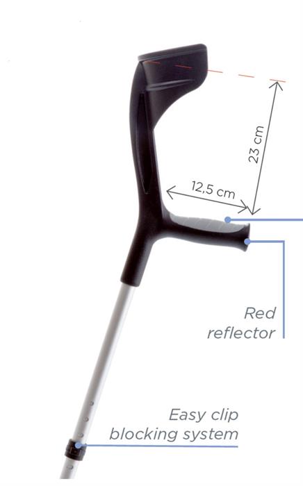 Leichte Unterarmkrücke. Ergonomisch geformter, rutschfester Griff mit weichem Innenpolster, spritzgegossen und aus einem Stück gefertigt, für Komfort und Sicherheit. Geräuschdämpfender Ring an der Schiebestange. Einfache Arretierung der Einstellung mittels Clip. Reflektierender Knauf an der Vorderseite.Produktdetails: